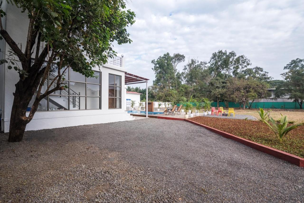 A relaxed luxurious space equipped with modern amenities such as a spacious living and dining area adorned with a TV, a large swimming pool, an outdoor sitting area, and a bonfire perfect for families and large groups to enjoy a pleasant getaway near Mumbai.